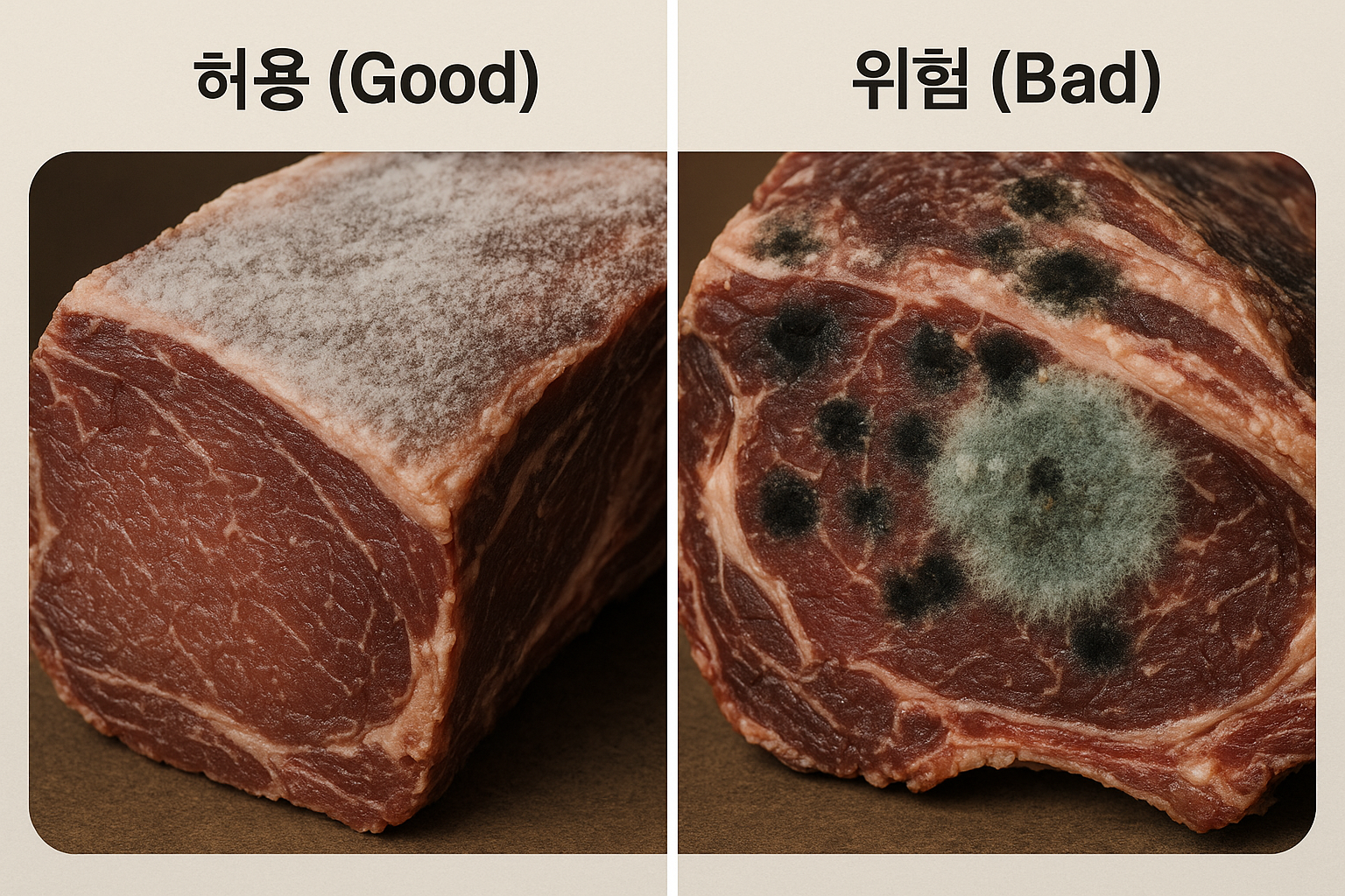 - 👍 허용 (Good): 고기 표면을 균일하게 덮는 하얀색 분말 형태의 곰팡이. (예: 페니실리움 날기오벤스)