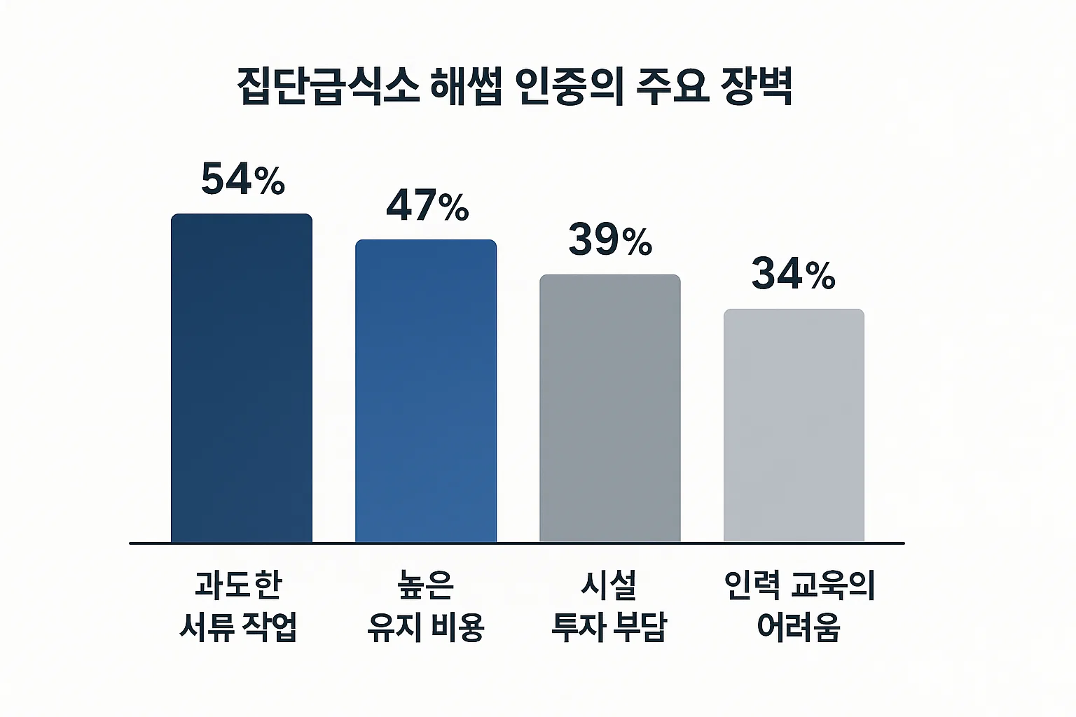[그래프] 집단급식소 운영자가 겪는 해썹 인증의 주요 어려움 위 그래프처럼, 현장에서는 까다로운 평가 기준, 높은 시설 투자 및 유지 비용, 과도한 서류 작업, 인력 교육의 어려움 등을 가장 큰 장벽으로 꼽습니다. 특히 타 업종에 비해 평가 항목이 월등히 많고(식품제조업 52개 vs 집단급식소 99개), 매일 바뀌는 메뉴마다 위해요소를 분석하고 기록해야 하는 부담은 상상 이상입니다.