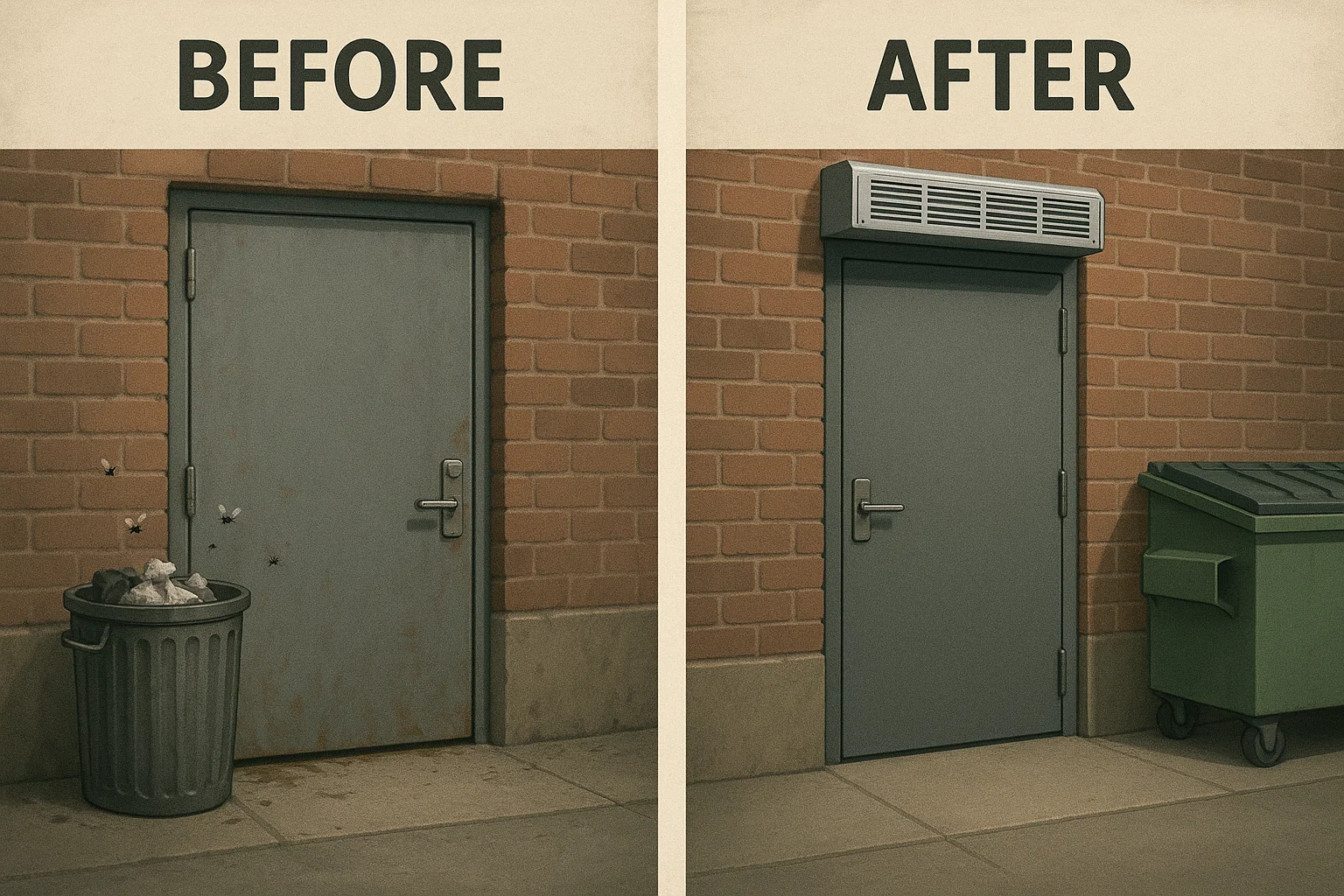 [그림 3] D&H 컨설팅을 통한 현장 개선 사례 구분 Before (문제 상황) After (D&H 해결책) 원인 진단 날파리가 보일 때마다 포충기를 추가 설치. 외부 쓰레기통의 음식물 잔여물이 날파리의 서식지임을 확인. 후문 하단 틈새가 주 유입 경로임을 파악. 조치 단순 방제 활동에만 집중. ① 외부: 밀폐형 쓰레기통으로 교체 및 일일 청소.